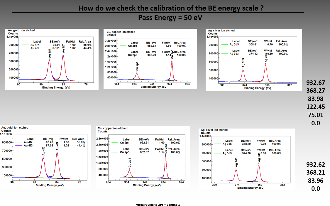 Energy Scales of chemical analysis instruments need reference energy points, Calibration Energies, that are used to define reliable, reproducible Energy values that are measured routinely (monthly) to check if the energy scale of an instrument has drifted or changed. This is a crucial check which ensures accurate energy measurements of the BEs obtained XPS spectra collected from all kinds of materials.