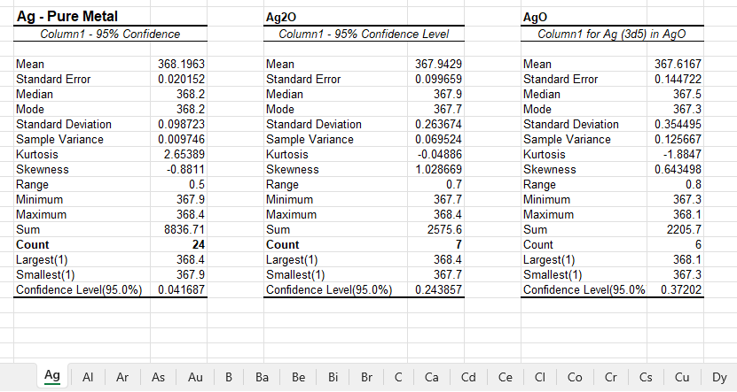 Standard Deviations et al for BEs from Pure Ag, Ag2O and AgO in NIST